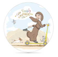 I have attempted to put her wisdom (“take fresh courage”) into visual form with two pieces. In the cartoon I visualise her moving forward. Even when she encountered bumps in the road, she hung on, trusting in the transforming presence of her good God… perhaps she was on her way to the supermarket? The COURAGE illustration (prayer card & poster) has a focus on her bold trusting heart/eyes, paired with the teal that links to the scarves that Sisters wore at the canonisation 10 years ago. Links to these images and all the resources are also listed below. I highly recommend the article by Sr Mary Cresp rsj and as well as all the SOSJ resources from the team based at North Sydney. We especially hope you will join us in prayer for the Courage Hour on October 16th.